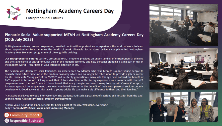 A recent example is Pinnacle’s work at Nottingham Academy with Year 10 students. With Pinnacle they got the chance to talk about the possibilities of work with the Pinnacle team, their Student Development and Linda Etheridge Social Value Mentor. Have a look at the story of one of the Pinnacle groundworks contractors.